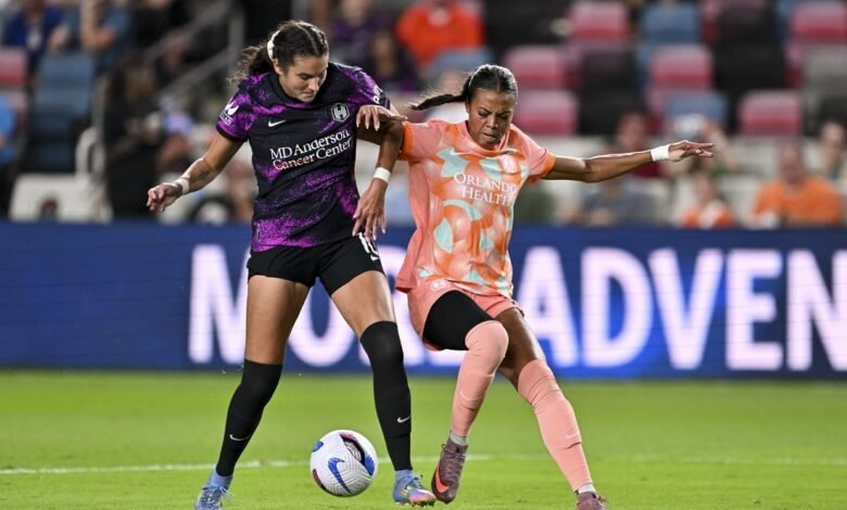 3 de octubre de 2025; Houston, Texas, Estados Unidos; El delantero de Orlando Pride Ally Watt (1) y el defensor de Houston Dash, Malia Berkeley (1) luchan por la primera mitad en el estadio de energía Shell. Crédito obligatorio: Maria Liceaker-Inmagan Images
