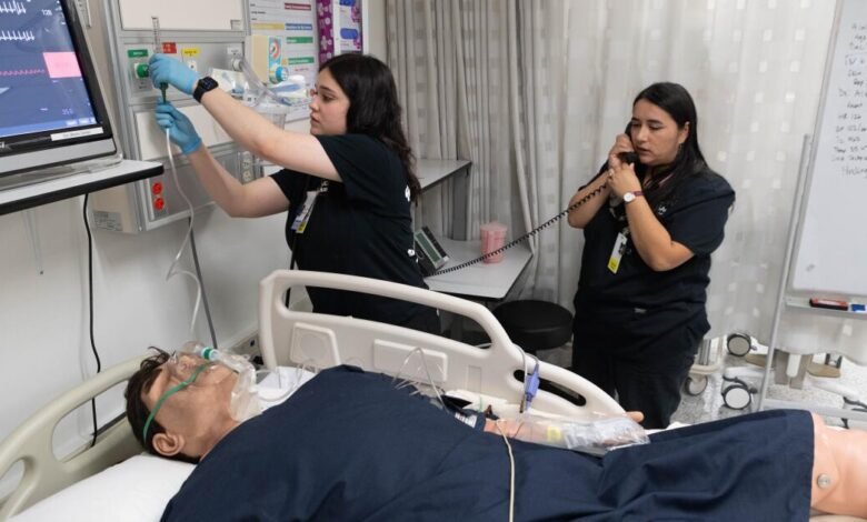 Otra idea es expandir el uso de la tecnología. En Mount Sac, por ejemplo, las aulas contienen modelos de alta tecnología que pueden programarse para destacar, gritar y simular una variedad de afecciones médicas, incluidos ataques cardíacos, sangrado e insuficiencia respiratoria, hasta el nacimiento. Programas de realidad virtual y mejorado Proporcione entornos 3D reactivos con animación o actores que simulen pacientes.