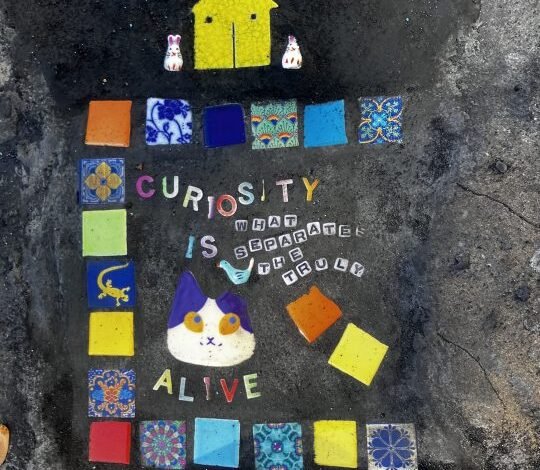 Comenzaron a llenar los huecos de las aceras con juguetes de dinosaurios y de ahí pasaron a hacer mosaicos.