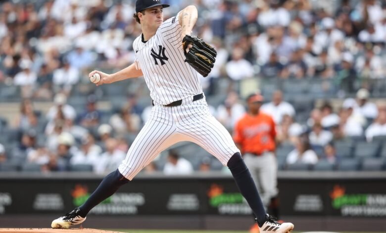 27 de septiembre de 2025; Bronx, Nueva York, Estados Unidos; En las primeras entradas contra los Orioles de Baltimore en el estadio Yankis de Nueva York, Pitch Cam Schlitler (1) está lanzando un lanzamiento. Crédito obligatorio: Imágenes de Wendel Cruise-Imagan