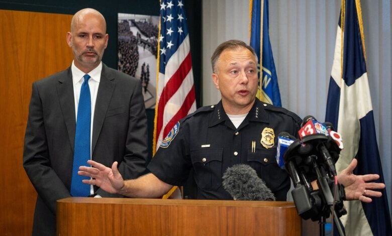 El jefe de IMPD, Chris Bailey, y los fiscales del condado de Marion, Ryan Miirs, discutieron una conferencia de prensa dentro del City-County Bhaban en Indianápolis el lunes, octubre de octubre del lunes 2021, el fin de semana del fin de semana. El analista de Fox Sports Mark Sánchez (1) enfrenta acusaciones de su presunto papel en la protesta.