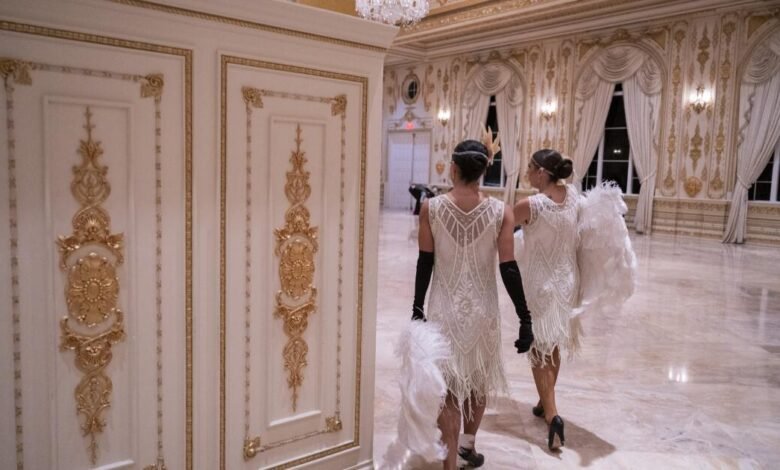 Los invitados de Trump, disfrazados de moscas rugientes de los años 20, contrabandistas y magnates anteriores al accidente, pasaron junto a una mujer con poca ropa que se retorcía seductoramente en una copa de champán gigante y entraron al salón de baile dorado debajo de un letrero Art Deco que explicaba el tema de la noche: «Una pequeña fiesta nunca mata a nadie».