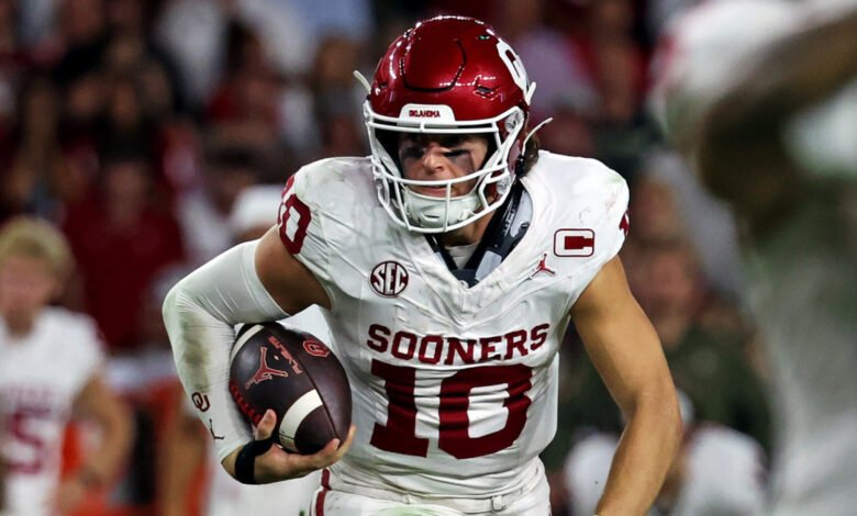 Playoff de fútbol universitario No. 11 Las probabilidades de Oklahoma de llegar al campo de 12 equipos aumentaron significativamente con una victoria como visitante 23-21 sobre el No. 4 Alabama (8-2, 6-1 en la SEC). Crimson Tide superó a Oklahoma por casi 200 yardas, 406-212, pero los Sooners (8-2, 4-2 en la SEC) se mantuvieron en el juego al forzar tres pérdidas de balón, incluida una selección de seis, y capturar al mariscal de campo de Alabama, Ty Simpson, cuatro veces. Alabama también tuvo más triples (cuatro) que tiros de campo (tres).