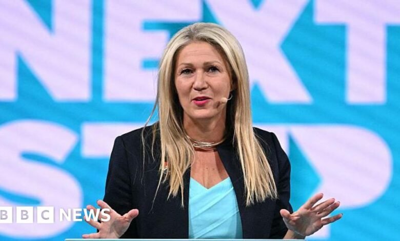 Getty Images Laura Anne Jones, vestida con una chaqueta negra y un top azul, está de pie en el podio con las manos en alto. Tiene un fondo blanco y azul detrás de él y lleva un micrófono.Imágenes falsas