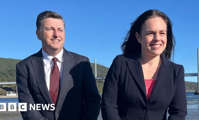BBC Douglas Alexander, vestido con un traje azul marino y corbata color burdeos, está sentado en la pared junto a Kate Forbes, vestida con una chaqueta oscura y un top rosa. Hay un puente y agua detrás de ellos.bbc