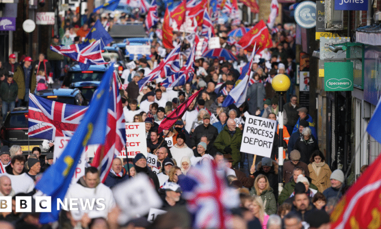 Eddie Mitchell Cientos de personas caminan por la calle principal de la ciudad. Algunas personas sostienen banderas sindicales y del condado de Sussex, mientras que una persona sostiene una pancarta que dice "proceso de detención deportación".Eddie Mitchell
