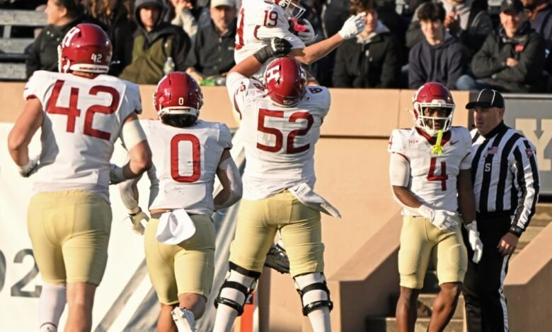 NEW HAVEN, CONNECTICUT – 22 DE NOVIEMBRE: Jaden Craig #1 de Harvard Crimson es interceptado por sus compañeros Aidan Kilstrom #52 y Jyrion Jackson-Bass #1 de los Yale Bulldogs durante la segunda mitad del juego 141 de “The Game” el 22 de noviembre de 2022 en Connecticut. (Foto de Sean D. Elliott/Getty Images)