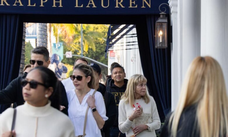 En Ralph Lauren en Rodeo Drive, se exhiben gafas de sol y polos sin descuentos. Luces parpadeantes adornaban los árboles en la entrada de la tienda y los empleados regalaron galletas a los compradores navideños.